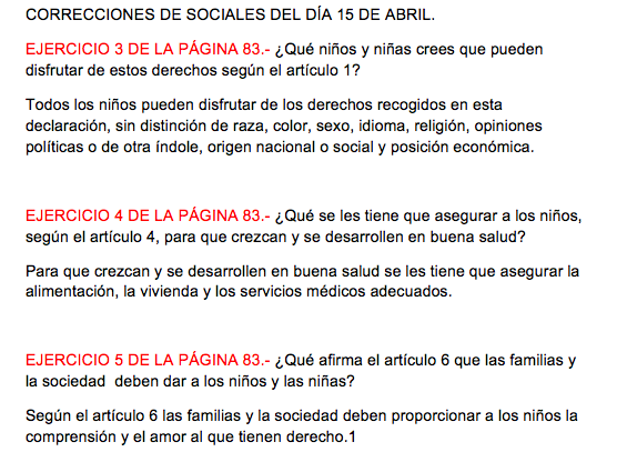 Os leéis varias veces la lectura "Derechos de la Infancia" de la página 83 y respondéis en el cuaderno a las preguntas de comprensión 3, 4 y 5 de dicha página.